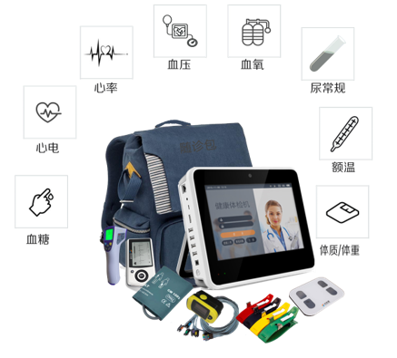 檢測內容:身高、體重、BMI、脂肪、血壓、血氧、體溫、便攜心電、腰臀比、打印機、血常規(guī)三項(血糖、總膽固醇、尿酸),血脂四項(總膽固醇、甘油三酯、高密度、低密度),數據自動上傳到平臺。